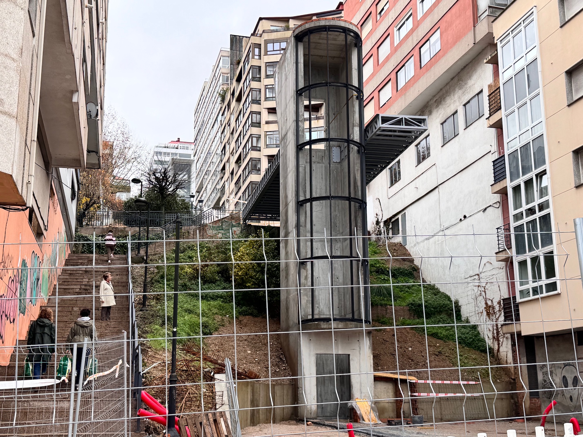 La fotografía muestra las obras de construcción de un nuevo ascensor urbano, concretamente, en la Rúa Juan Ramón Jiménez, de la ciudad de Vigo. Se trata de una obra muy necesaria para comunicar unas zonas urbanas con una orografía agresiva que dificulta la comunicación.