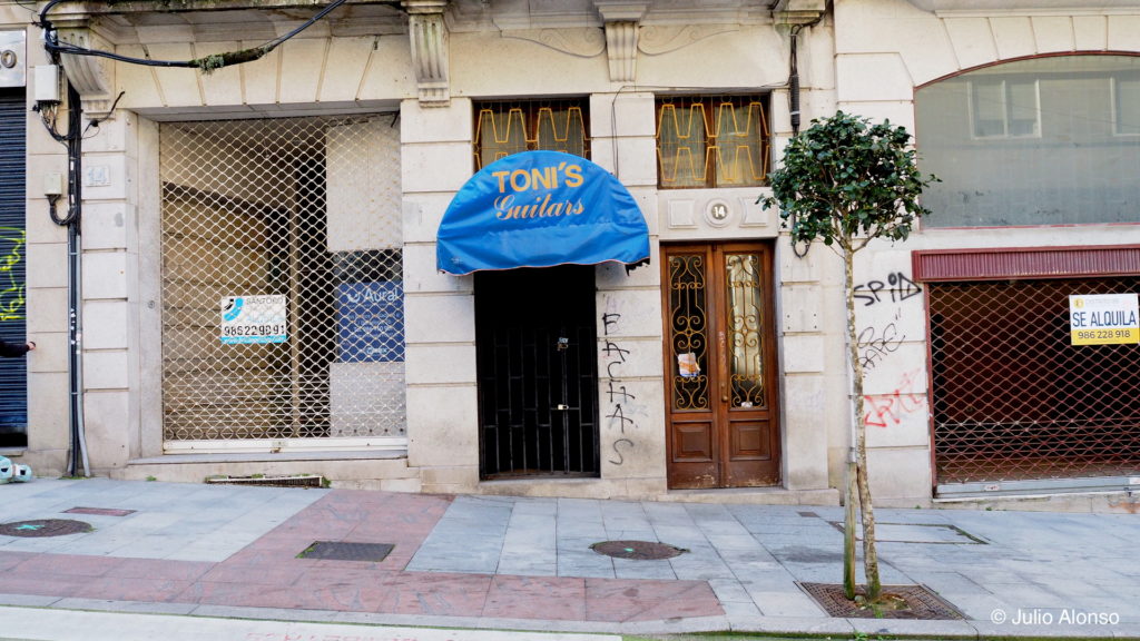 Cruzando la calle, en la esquina de la izquierda está “Distrito 85”, una inmobiliaria y, con una entrada que pasa inadvertida, los “Almacenes Prieto”. A su lado la entrada de “Toni’s Guitar”, un pub histórico en la ciudad de Vigo al que se accede bajando unas profundas escaleras. Una vez abajo parece un mundo diferente al de la superficie, con una decoración recargada de objetos muy curiosos que le dan un toque kitsch y con una música de varias épocas que contribuyen en su conjunto a un ambiente muy animado, agradable y familiar.