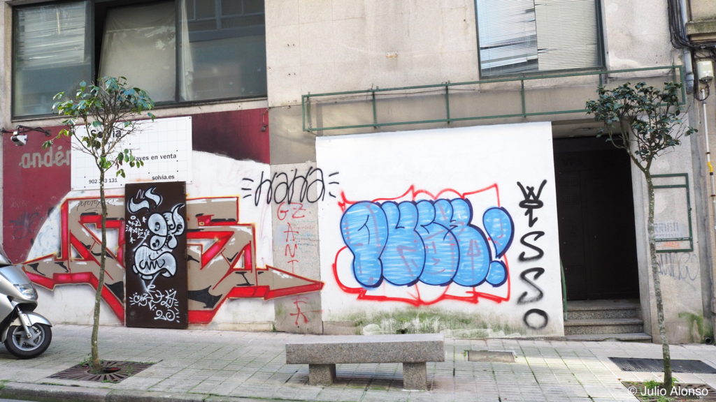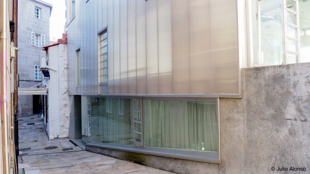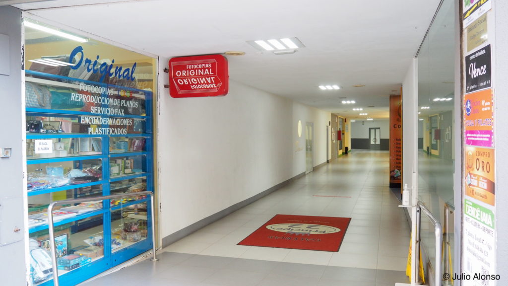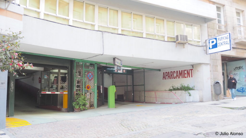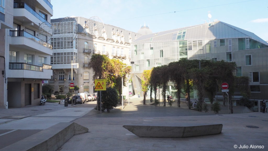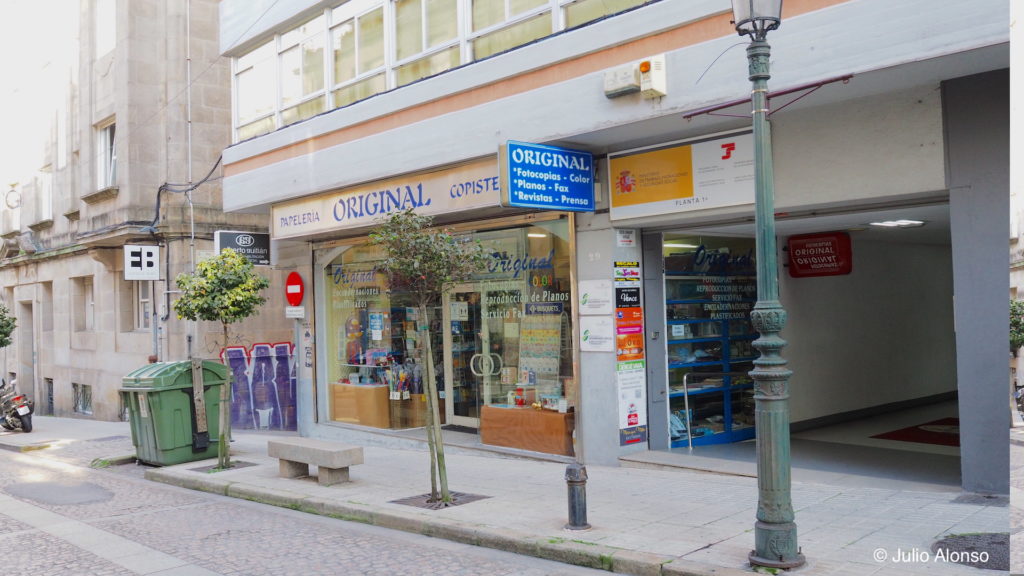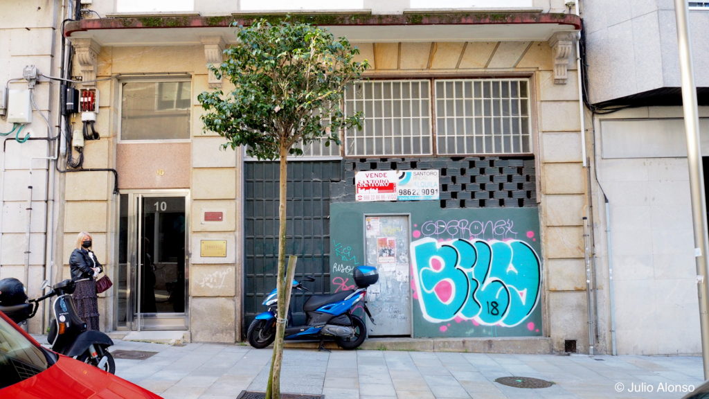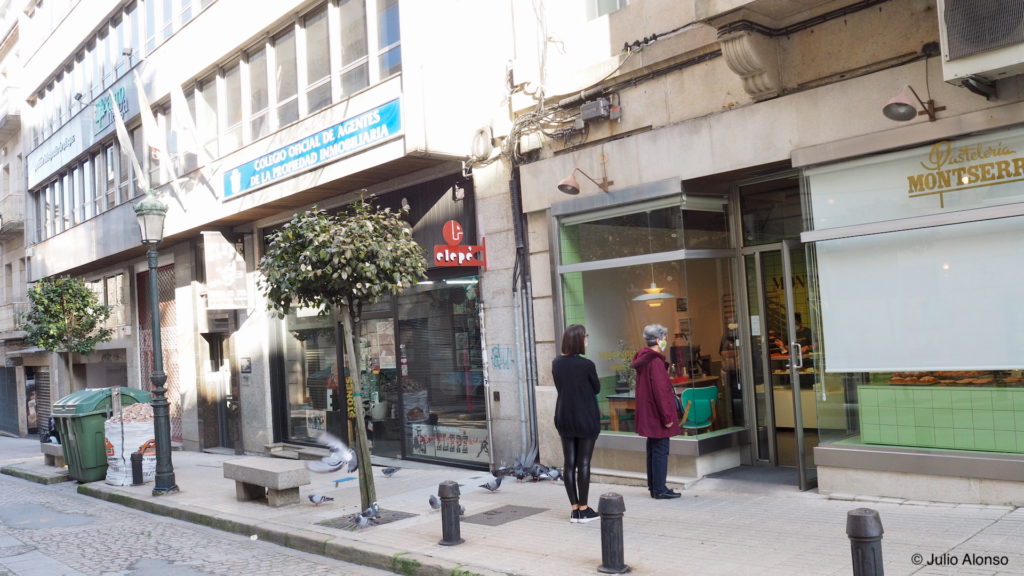 En el local contiguo estaba el comercio “Andén”, especializado en maquetas de trenes. En su escaparate llamaba la atención una enorme y preciosa maqueta con montañas, edificios y varios trenes circulando sin parar, pero la tienda cerró hace años y el local está tapiado, aunque el nombre todavía se conserva en la fachada. Unos metros más abajo está el restaurante “Casa Moncho”, algunos edificios de viviendas, las entradas de algunos garajes y un precioso edificio de Michel Pacewicz haciendo esquina con la Rúa López de Neira. En su día, ese edificio fue el “Círculo Católico de Obreros” y su fachada todavía luce los relieves de grandes escudos vinculados con la mencionada organización. En el bajo de ese edificio, justo en la esquina, estuvo durante muchos años la famosa peletería “Platero”.