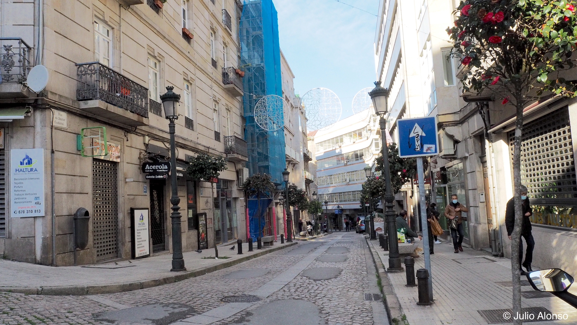 En el comienzo de la calle, haciendo esquina con la Rúa do Progreso, hubo una tienda de fotografía que estuvo abierta durante años y a su lado estaba el “Café Bar Acerola”, que también está cerrado. Continuando por la izquierda de ese tramo destaca una tienda de estética, una escuela de danza y una tienda de decoración llamada “La Victoriana”, que merece una detenida visita para disfrutar con su amplio muestrario de muebles y objetos curiosos, desde radios antiguas y mobiliario vintage hasta una auténtica canoa de madera.