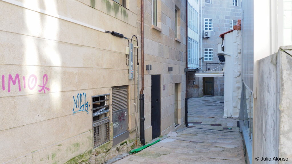 Después de varios edificios de viviendas con sus portales y entradas de garajes está el “Centro Dental Villamarín” y a pocos metros está la asesoría fiscal “Cyten”, donde la calle se ensancha con una pequeña zona ajardinada, frente a la Praza do Pobo Galego, con una tienda de “Biscuits Galicia” y unas escaleras muy empinadas que comunican con la Rúa II República, en la parte posterior del Edificio Simeón, cuya fachada lateral transcurre en el último tramo de la calle al llegar a la Porta do Sol.