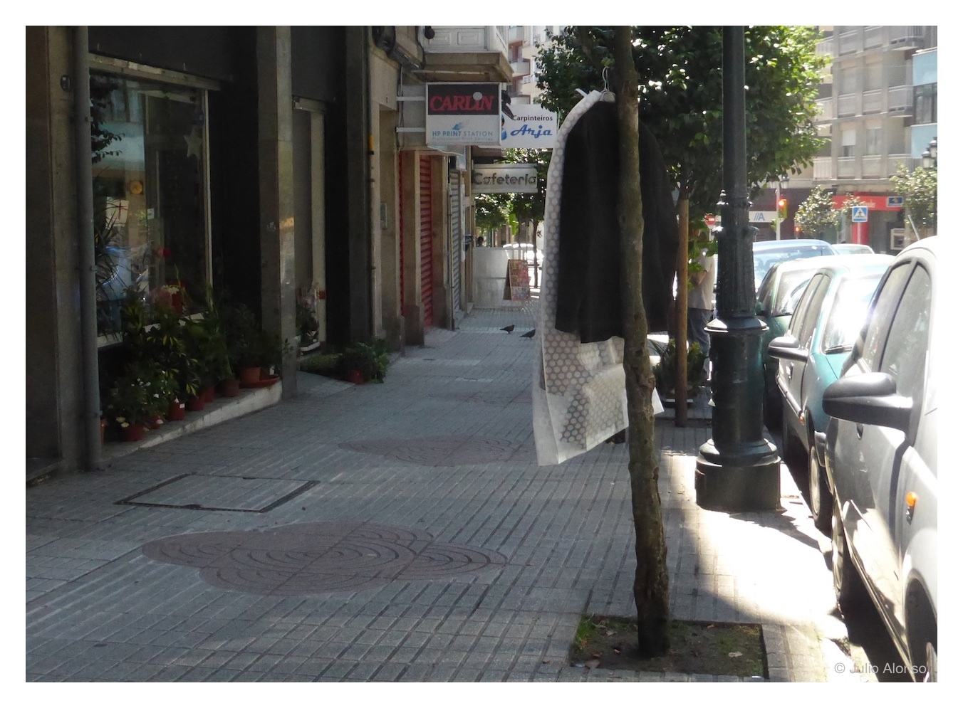 En la fotografía observamos unos trajes en buen estado que alguien ha colgado de la rama de un árbol de una céntrica calle, a la espera de que alguien se los lleve para aprovecharlos. Lo que también puede deducirse es que esos trajes quizá se hayan utilizado en algún trabajo temporal que ya no tiene renovación, o en alguna boda fracasada de esas para las que se solicita un crédito para el convite y el viaje y el divorcio se echa encima mucho antes del final de la amortización, como aquella familia a la que se le casó una hija, pidieron un crédito para celebrar la boda, y la hija volvió a la casa de los padres cuando a estos todavía les faltaban varios años para saldar la deuda.