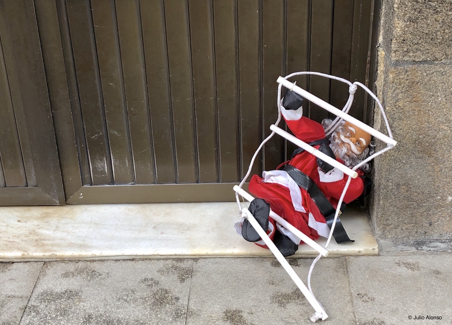 Las fiestas navideñas han llegado a su fin. Se terminó el brillante espectáculo de tantas luces, la fiebre consumista de compras y regalos, las comidas copiosas, el ir de una casa a otra, de viajar… Esta fotografía, tomada en una calle de la ciudad de Vigo, lo deja muy claro: ahí tenemos un Papá Noel acompañado de su escalera y abandonado en el portal a la espera del camión de la basura. Es un buen símbolo de que todo es efímero, incluso las fiestas más multitudinarias.
