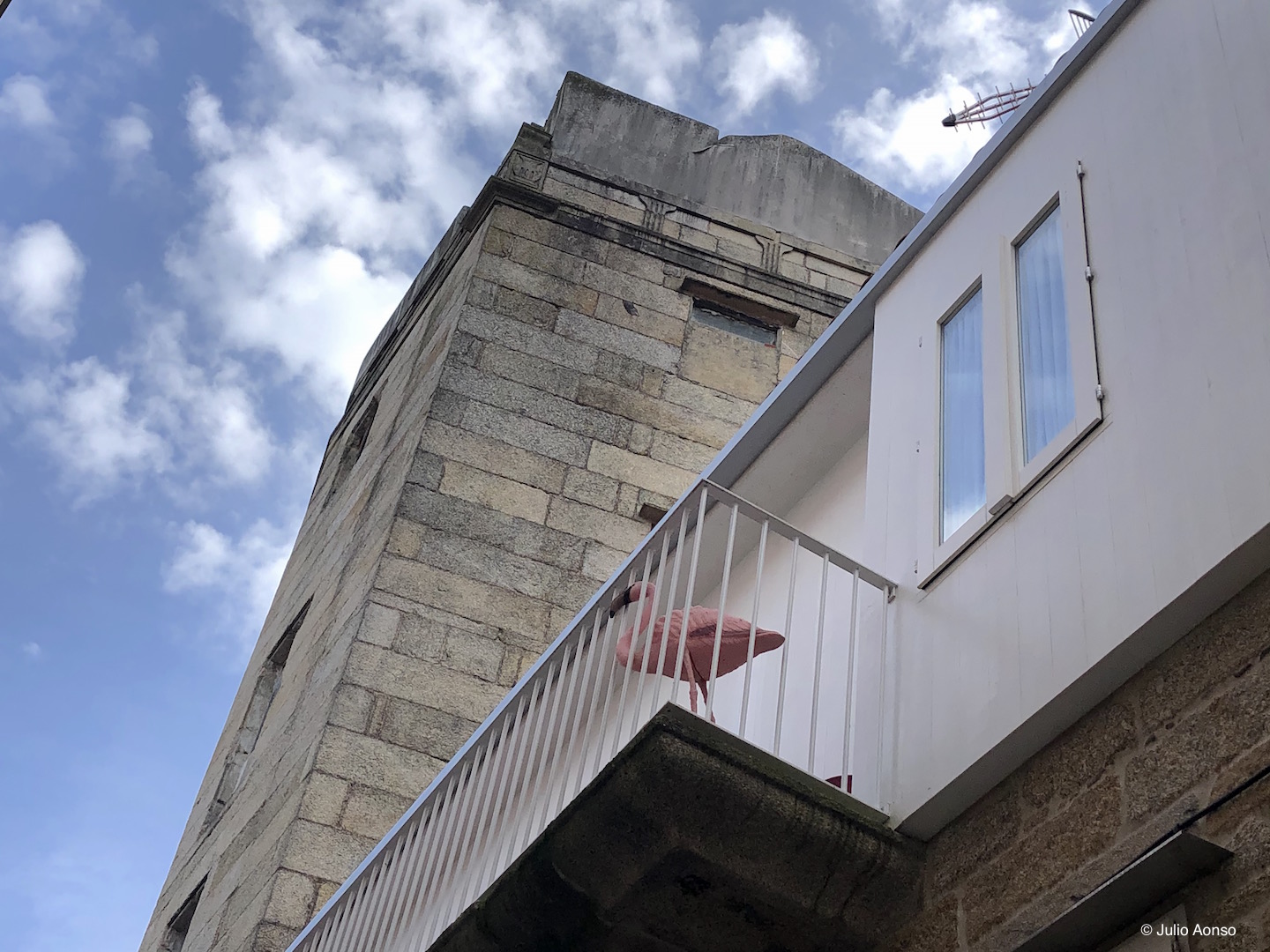 En la ciudad de Vigo no hay más flamencos que el que se observa en la fotografía, tomada en una calle del Casco Vello. Los flamencos suelen sobrevolar y anidar en otras latitudes. Pero alguien que sin duda aprecia su belleza ha decidido colocar una en el balcón, como un símbolo de añoranza, mirando hacia el horizonte.