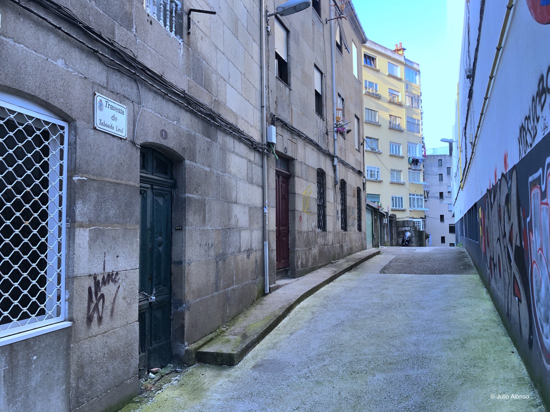 La Travesía de Taboada Leal, como tantos callejones y calles pequeñas de la ciudad de Vigo y de otras grandes urbes, pasa inadvertida a los ojos de los viandantes y es preciso darla a conocer. Es un vial de trazado recto y, como puede observarse en la imagen, tiene portales y garajes que dan exclusivamente a esa calle. Es otro rincón de la gran ciudad de Vigo.