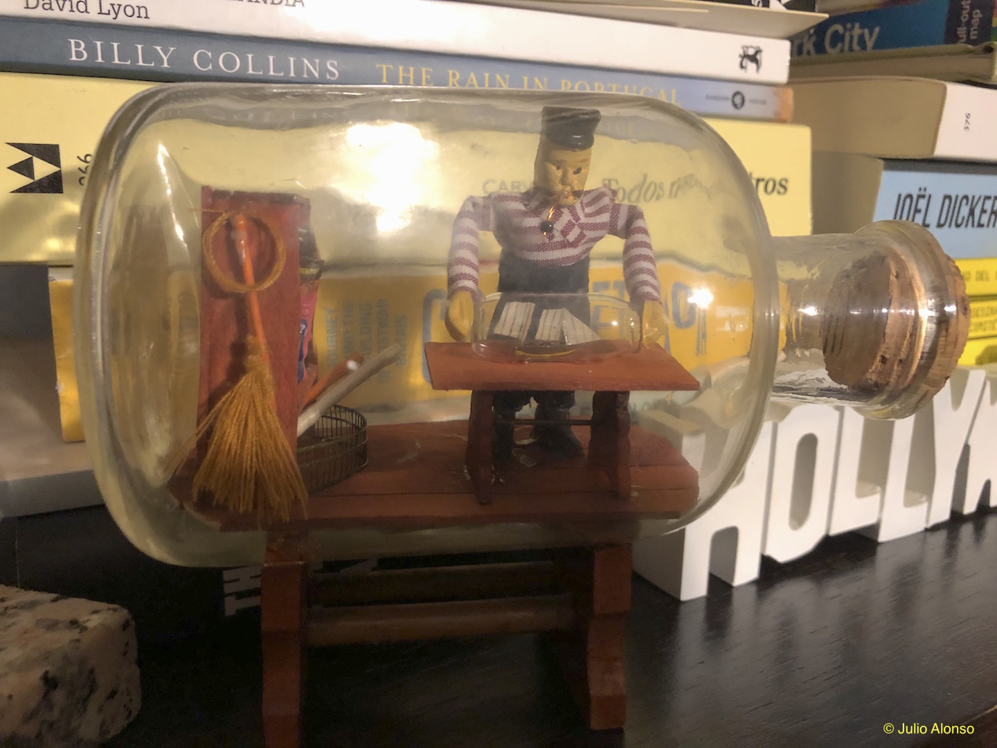 Este objeto haría las delicias de los amantes del mar. En la fotografía se puede ver a un hombre que construye un barco dentro de una botella y que, a su vez, el taller del artesano está dentro de otra botella de mayor tamaño, las dos bien cerradas con sendos tapones de corcho.