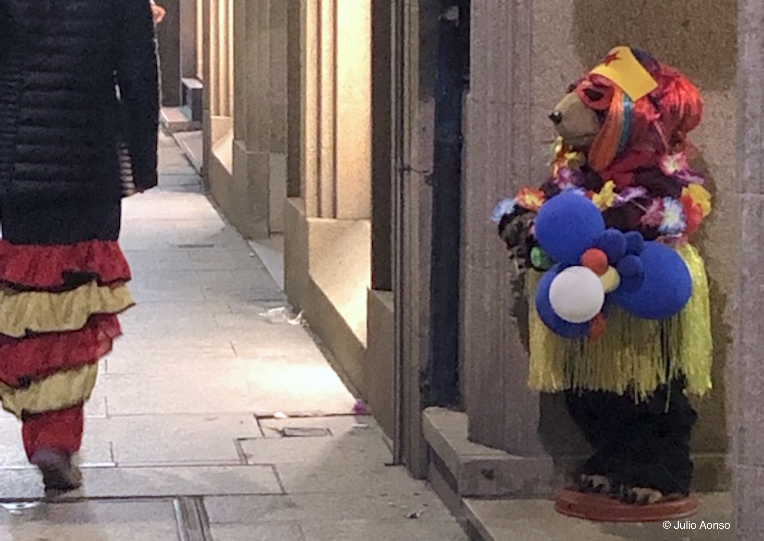 El carnaval siempre deja imágenes insólitas y curiosas. Es el caso de esa figura que aparece en la fotografía y que estaba en la puerta de un edificio de la Rúa do Príncipe, en la ciudad de Vigo. La imagen fue tomada durante los carnavales y a primera vista parece tratarse de un perro de carne y hueso que está disfrazado.