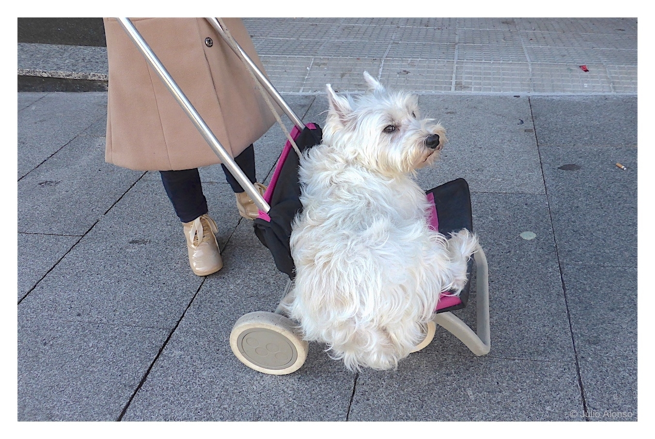 Este perro va de paseo, pero en cochecito. Es un perro cómodo, según nos han contado sus dueños. Y ya lo tienen asumido. Él va tranquilo observando el ambiente de la Porta do Sol, de Vigo, concurrida de transeúntes en unas fechas navideñas secas y soleadas que, por cierto, contribuyen favorablemente al comercio local. Y conviene indicar, para quienes no lo sepan, que existen cochecitos similares a los de los bebés especialmente diseñados para perros, que van totalmente tapados por una red y que pasan inadvertidos, aunque en Vigo ya se han visto algunos. Lo que no sabemos en este caso concreto es el comportamiento de este perro cuando se encuentre con otros congéneres que no tengan la misma suerte y que tengan que ir a cuatro patas. Sea como fuere, todos los mimos son pocos.