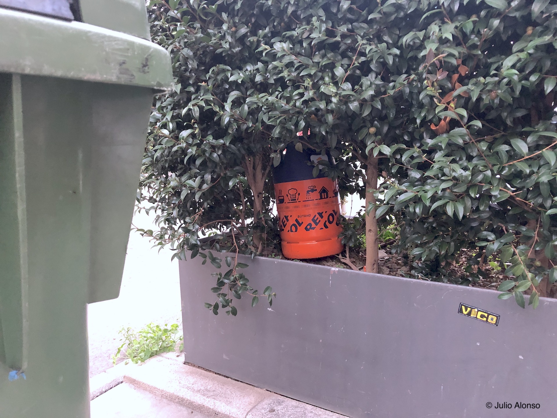 La imagen es insólita. Se trata de una bombona de gas de uso doméstico abandonada en una jardinera de una céntrica calle de la ciudad de Vigo. En el momento de tomar la fotografía no llegamos a saber si el recipiente contenía gas porque no lo hemos tocado por prudencia, ni tampoco llegamos a saber el motivo del abandono en ese lugar. En otros tiempos y en otros lugares de España esto sería motivo de alarma, pero todo eso ya ha quedado en el amargo y sangriento recuerdo de algo que no debe volver a repetirse nunca más. Lo que también resulta extraño de esta bombona es que la hayan abandonado aunque estuviera vacía, porque el precio del recipiente no es despreciable.