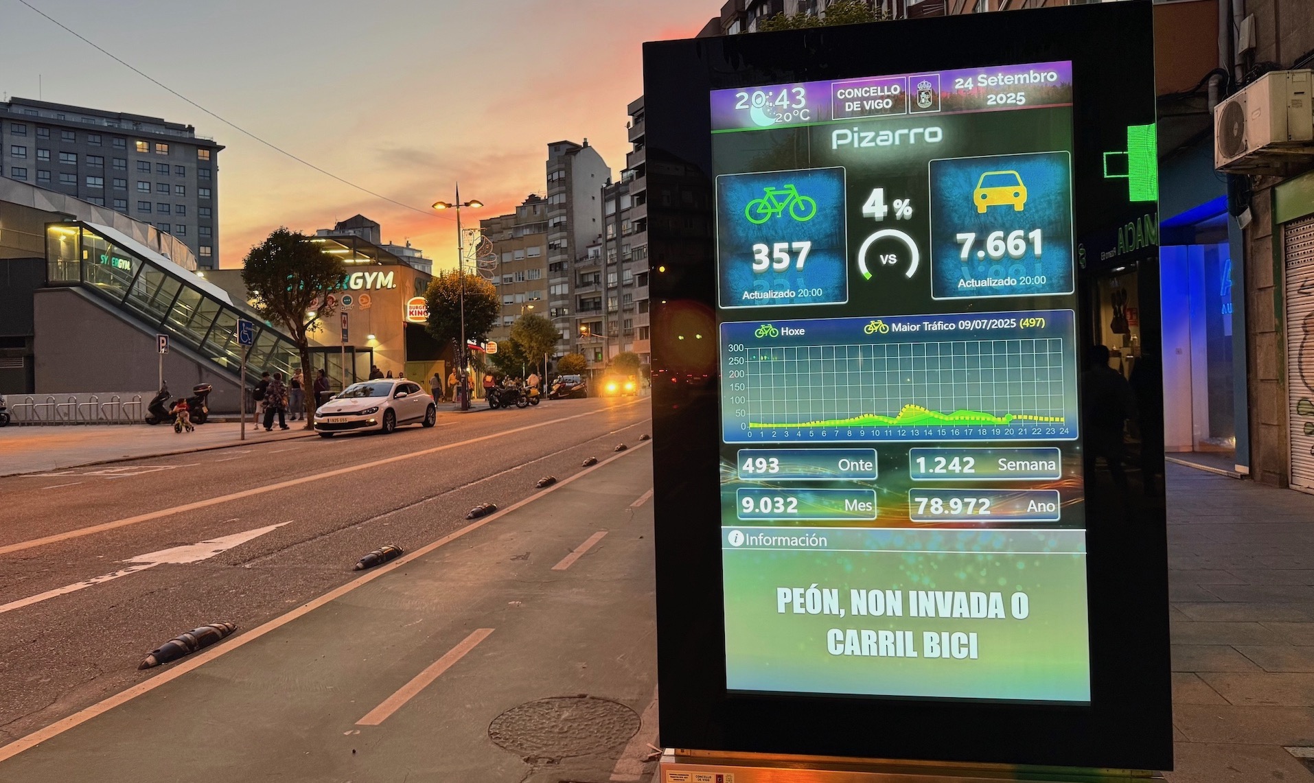 Al cabo de varios años de existencia, el carril bici de la ciudad de Vigo se ha consolidado como una alternativa a los desplazamientos urbanos. Lo que en un principio fue motivo de críticas hoy ya es una realidad, y cada vez es mayor el número de personas que lo utilizan. Estos paneles que muestra la fotografía, y que están ubicados en determinadas localizaciones de los recorridos, indican el número de bicicletas y patinetes que utilizan el carril, así como su porcentaje con respecto al tráfico convencional. Sin duda, el éxito compensa las molestias e incluso la disminución de plazas de aparcamiento. La ciudad de Vigo se ha ido transformando hacia una humanización alejada de la dependencia de los vehículos de combustión, una ciudad donde la prioridad son las personas y el medio ambiente. Un éxito.