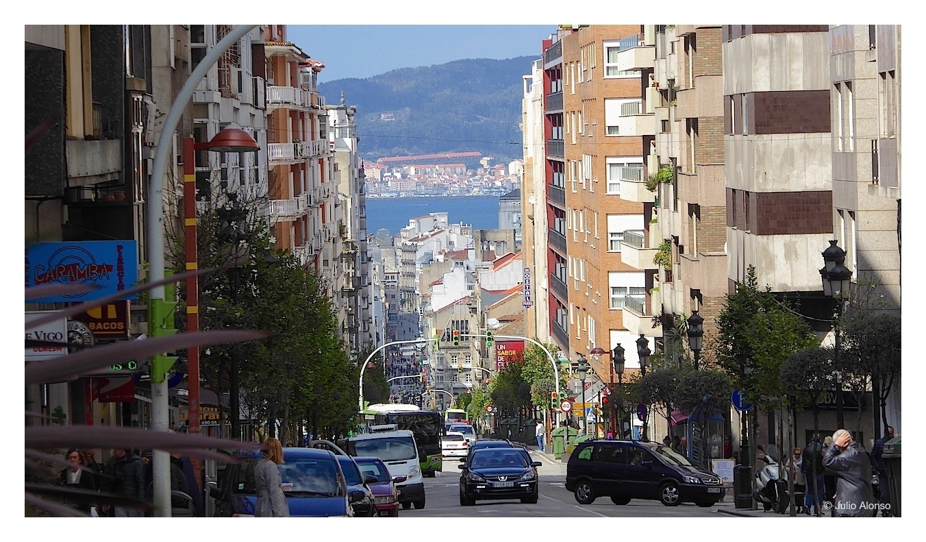 Pero muchas de las fotografías tomadas en la ciudad de Vigo también dan buena cuenta de la inclinación de sus calles, volcadas hacia el mar, hacia la ría del mismo nombre: la ría de Vigo, que ha sido escenario de importantes acontecimientos históricos como la batalla de Rande (1702); y refugio, a lo largo de los siglos, de numerosos barcos amparándose de los temporales; y puerto de partida, sobre todo, para viajeros que iban en busca de una vida mejor y que luego, en muchos casos, no pudieron retornar jamás. En esta fotografía, tomada desde el cruce de Los Llorones, se puede apreciar la calle Urzaiz en toda su dimensión, uniéndose con la calle del Príncipe y la Porta do Sol, mostrando una dilatada y vertiginosa perspectiva que desemboca, precisamente, en ese mar azul que es uno de los principales valores y reclamos turísticos de esta ciudad española del noroeste peninsular, con la vista del Morrazo al fondo, recortándose en el horizonte.