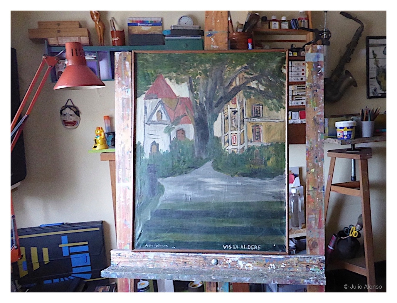 Al otro extremo de la finca, ya en la Calzada, había otra puerta que en su tiempo permitía bajar hasta Guixar, donde tenían amarrado un yate. Todo esto es recordado con nitidez por el pintor vigués Jesús Feliciano —-Jesús Feliciano Valiente—-, afincado en Tui, que durante muchos años tuvo un gran contacto con la familia. Recuerda, por ejemplo, que llegaron a recorrer parte de aquellos túneles y el que iba hacia el mar estaba ya casi derruido. Recuerda, también, la mina de agua y la barca que flotaba en el lago. Jesús Feliciano, cuyas obras han sido expuestas en diferentes ocasiones en Portugal, donde tiene una gran aceptación y valoración, tiene un estilo totalmente diferente al de sus comienzos, cuando pintó el cuadro que se muestra en esta fotografía tomada en un rincón de su estudio.