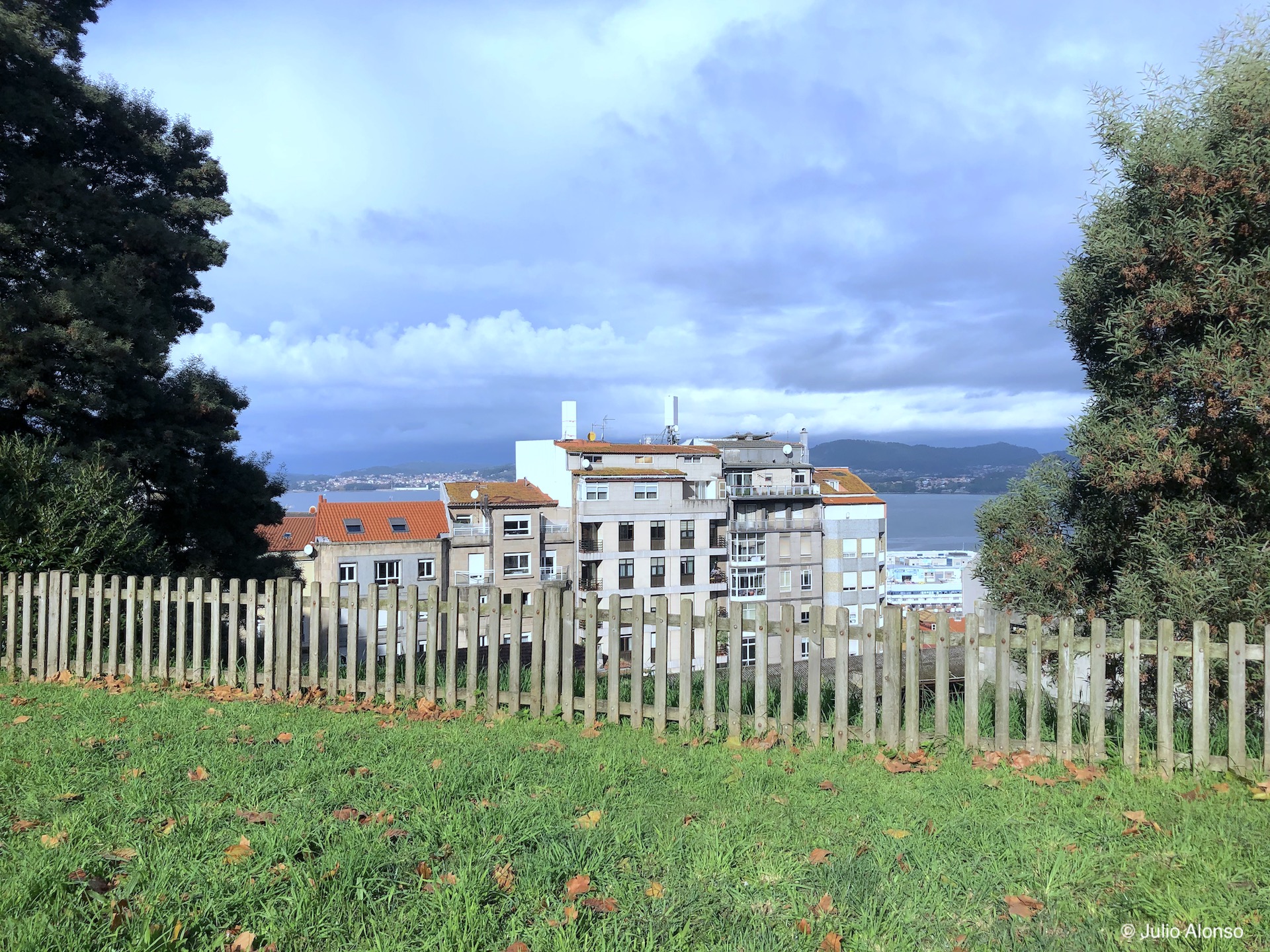Lo que muestra la fotografía es un mirador de la ciudad de Vigo. Efectivamente, no puede verse el mar ni tampoco las poblaciones de la península de O Morrazo, que está enfrente. Pero no se trata de un caso aislado, sino que es algo general en toda la ciudad.