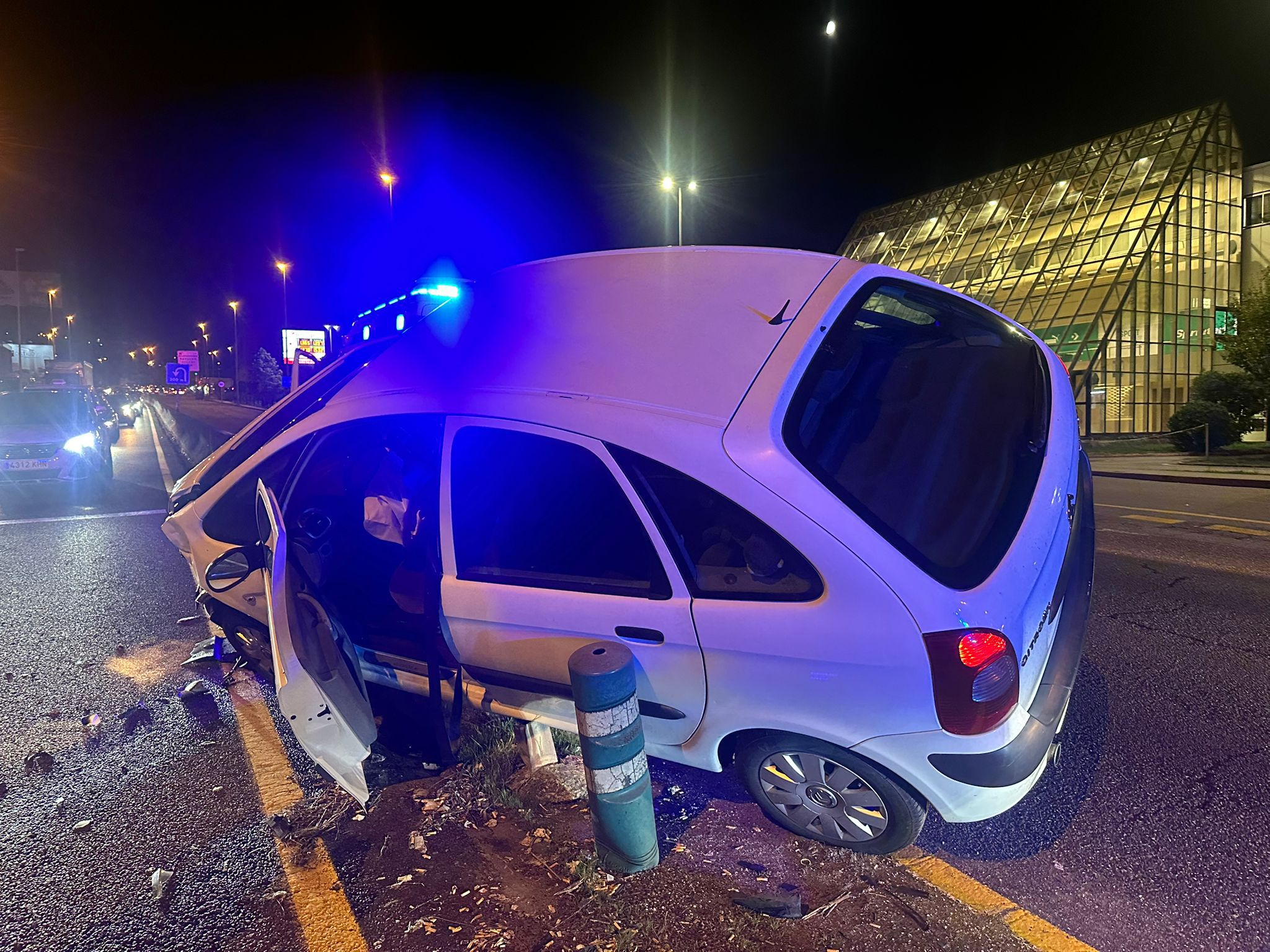 La Avenida de Madrid registró a última hora de este miércoles un aparatoso accidente con un coche semivolcado tras chocar contra la mediana y quedar empotrado a la misma.