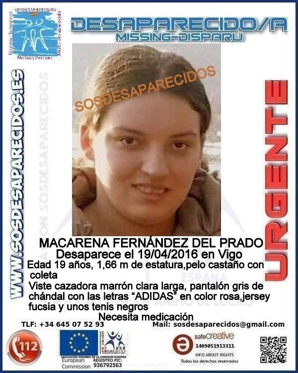 Se llama Macarena Fernández del Prado, tiene 19 años y necesita medicación. Guardia Civil y la asociación SOS Desaparecidos han hecho pública la imagen de una joven desaparecida hace dos días en Vigo.