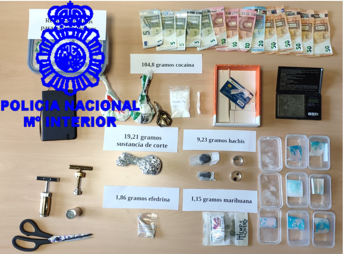 Fruto de ello se intervinieron algo más de 100 gramos de cocaína, 10 gramos de hachís, una pequeña cantidad de marihuana, diversas sustancias de corte y diverso dinero en efectivo. La intervención fue llevada a cabo por agentes del Grupo de UDEV-Drogas, perteneciente a la Brigada de Policía Judicial. El acusado fue puesto a disposición del mencionado juzgado.