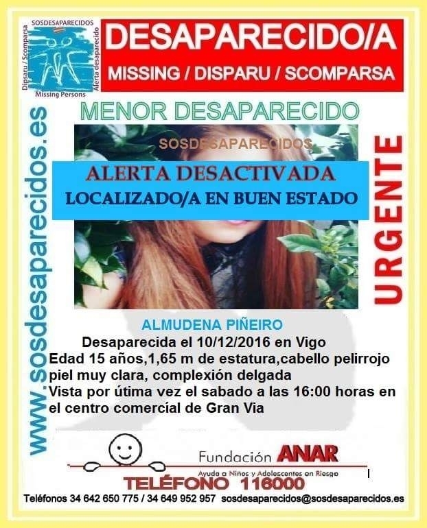 Alerta desactivada y fin a la angustia que vivían los familiares y amigos de Almudena Piñeiro, la menor de edad que la tarde del sábado desapareció sin dejar rastro. A media tarde de este domingo, amigos de la adolescente confirmaban a VIGOÉ que había aparecido.
