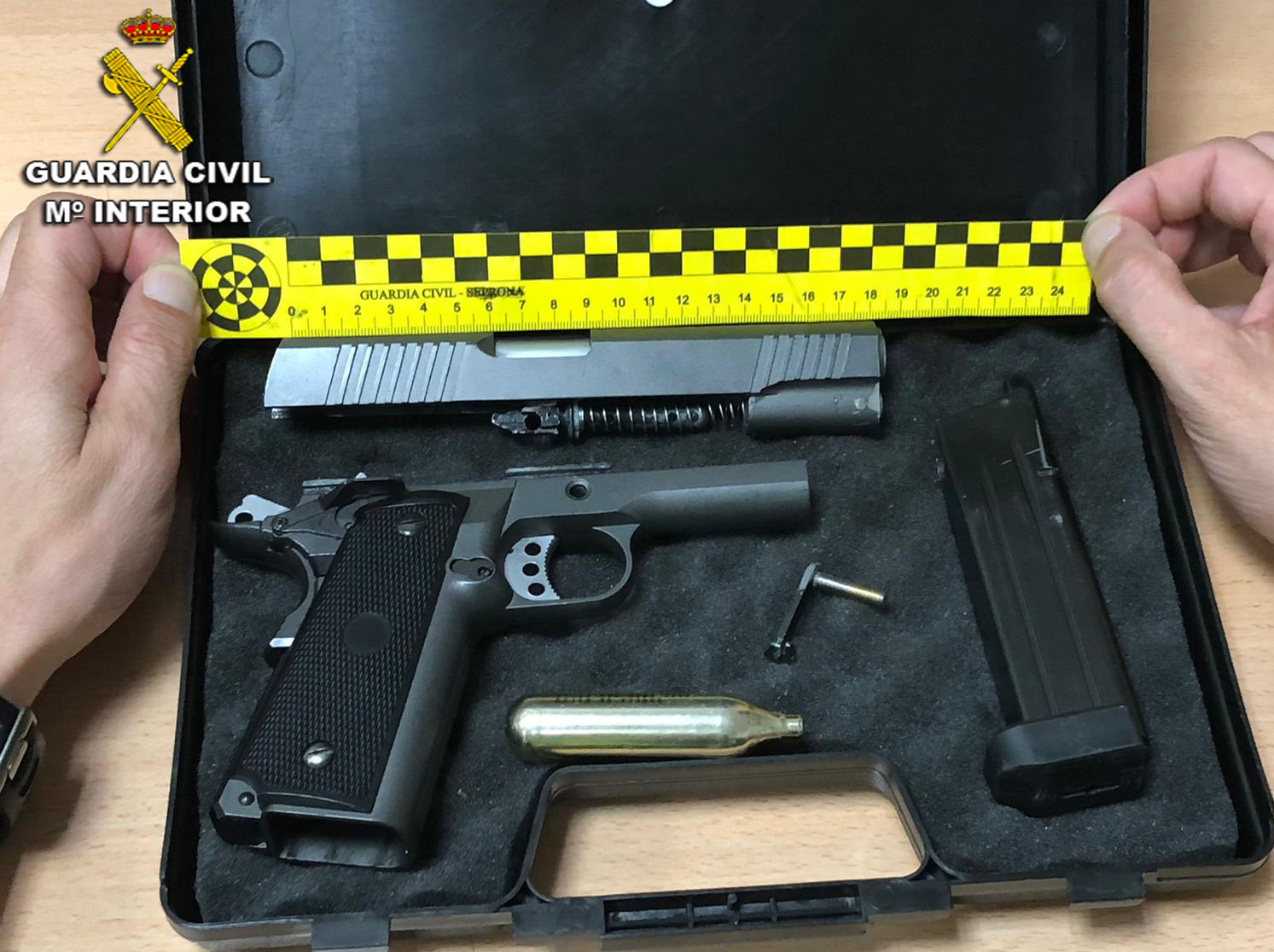 En uno de los vehículos inspeccionados en el control, la Guardia Civil se incautó de una pistola “Airsoft” que, además de estar manipulada para propulsar bolas de acero, presentaba unas características externas que inducen a una confusión sobre su auténtica naturaleza al tratarse de una perfecta imitación de un arma de fuego real.