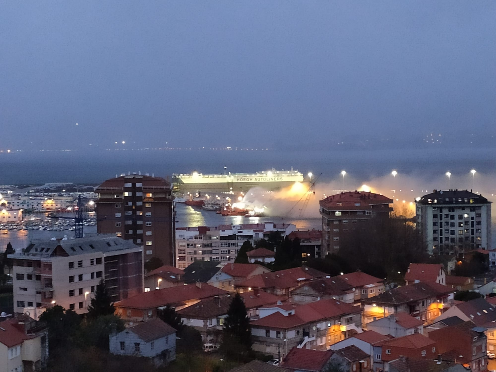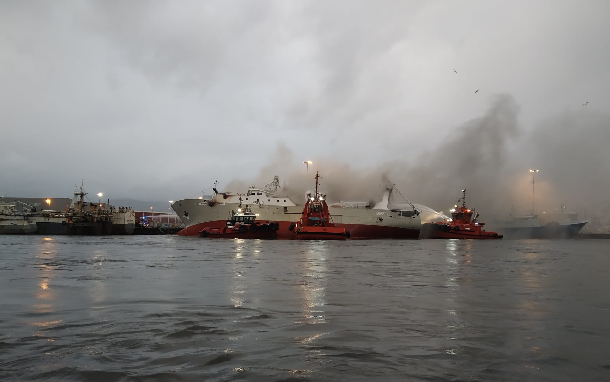 El ‘Baffin Bay’ avanza inexorablemente hacia su hundimiento a lo largo de la noche en el muelle de Bouzas. De hecho, ya se habría hundido por la tarde si no fuera por los dos remolcadores de Salvamento Marítimo que lo han sujetado durante horas contra el muelle de reparaciones de Bouzas, donde se encontraba atracado a primera hora de este jueves cuando se declaró un incendio en su bodega.