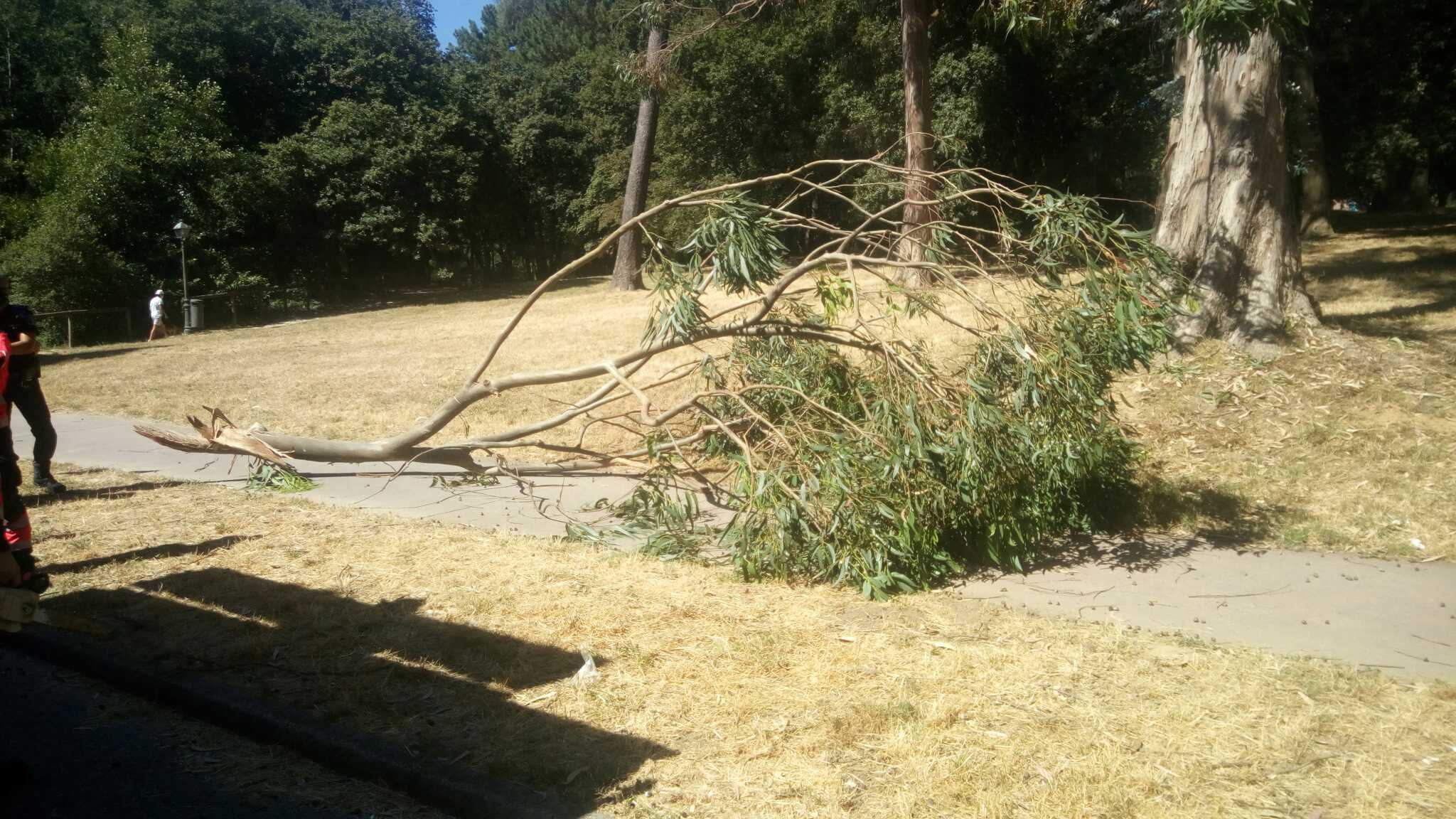 Dos dotaciones de efectivos del parque de Balaídos acudieron este miércoles a la calle Padre Seixas ante el riesgo de desplome de varias ramas de un eucalipto del parque de A Bouza sobre la vía pública. De hecho una de grandes dimensiones ya se había caído sobre la acera.