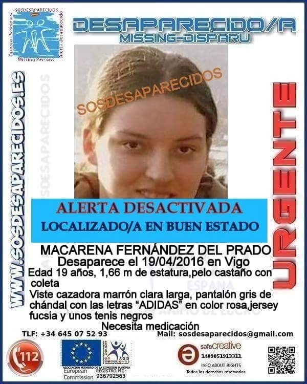 En la tarde del pasado martes salió de su casa, en el barrio de Balaídos, sobre las 17:15 horas y no habín vuelto a saber nada. Padece una minusvalía del 83%, con arritmias y ataques epilépticos, por lo que era importante localizarla cuanto antes para que tomase su medicación. Su familia dio aviso a SOS Desparecidos y con la ayuda de la Guardia Civil se lanzó la alerta en redes sociales.