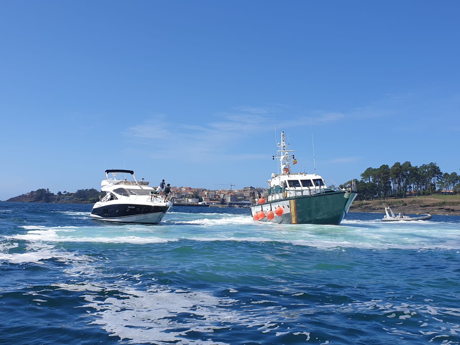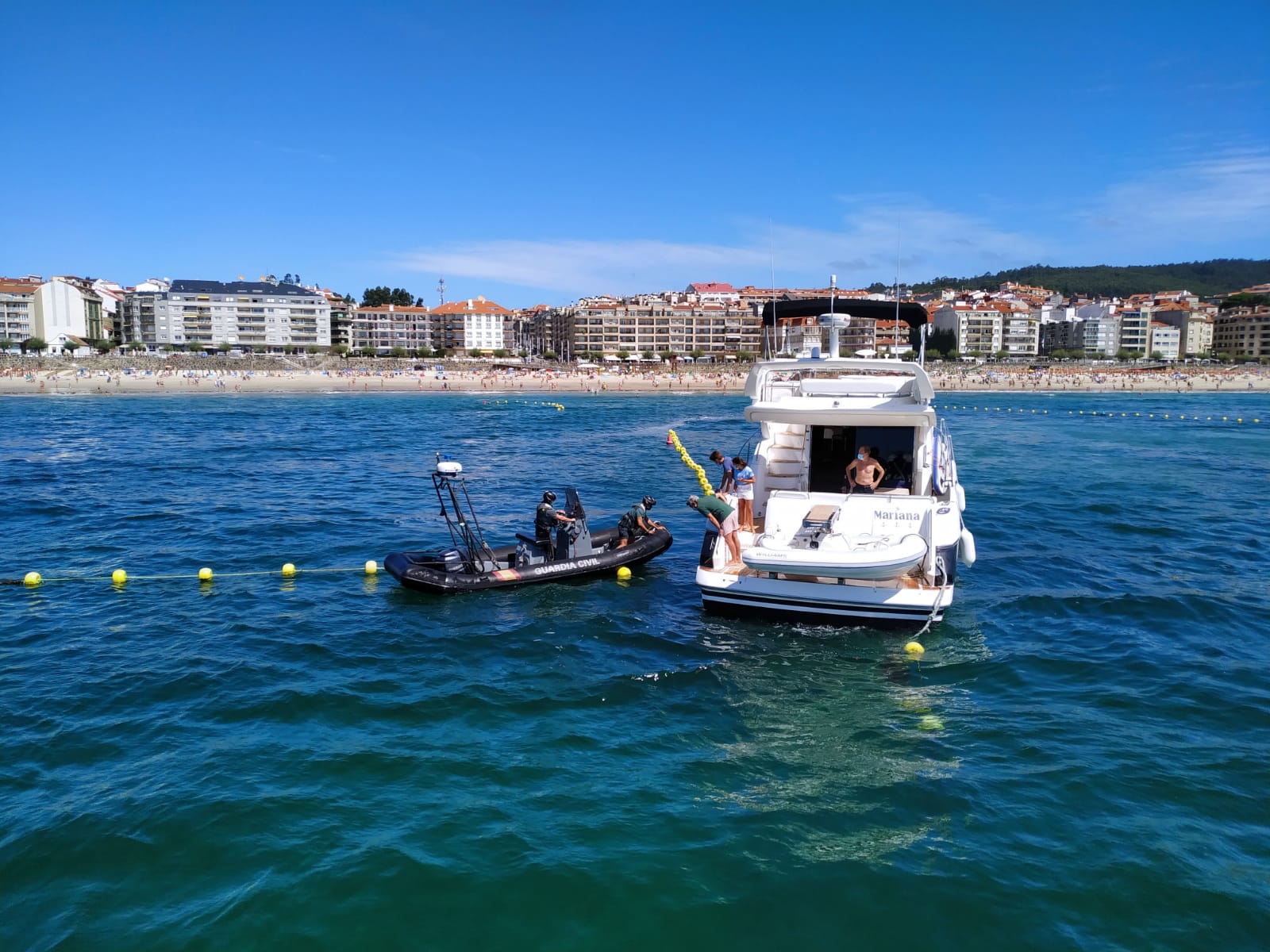 Habían transcurrido apenas quince minutos desde que finalizase otro operativo de remolque de una embarcación, que comenzó pasadas las 13:30 horas. Así, apenas una hora y media antes, los agentes tuvieron que acometer otro rescate, en esta ocasión más complejo ya que se trataba de un yate que no podía maniobrar por encontrarse enganchado a las boyas de balizamiento del canal de acceso a la playa de Silgar, con riesgo de varar.