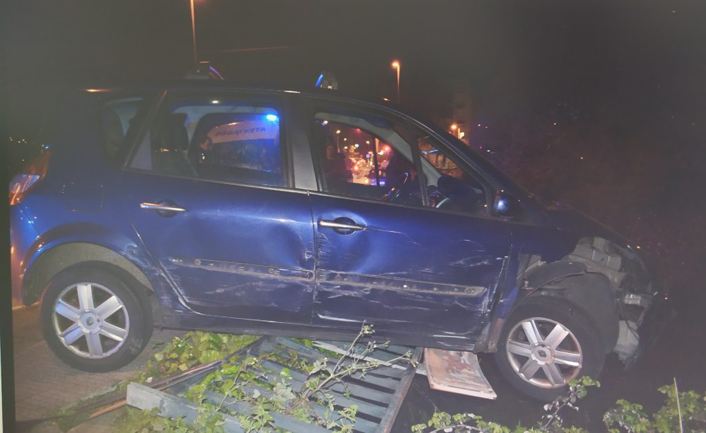 La primera de las incidencias tuvo lugar en la Avenida da Ponte, en las cercanías de Ramón Nieto, donde un vehículo se salió de la carretera y se quedó colgando de un puente, teniendo que ser sujetado con un todoterreno. Con todo, el conductor y la acompañante estaban fuera de peligro en el exterior del automóvil.