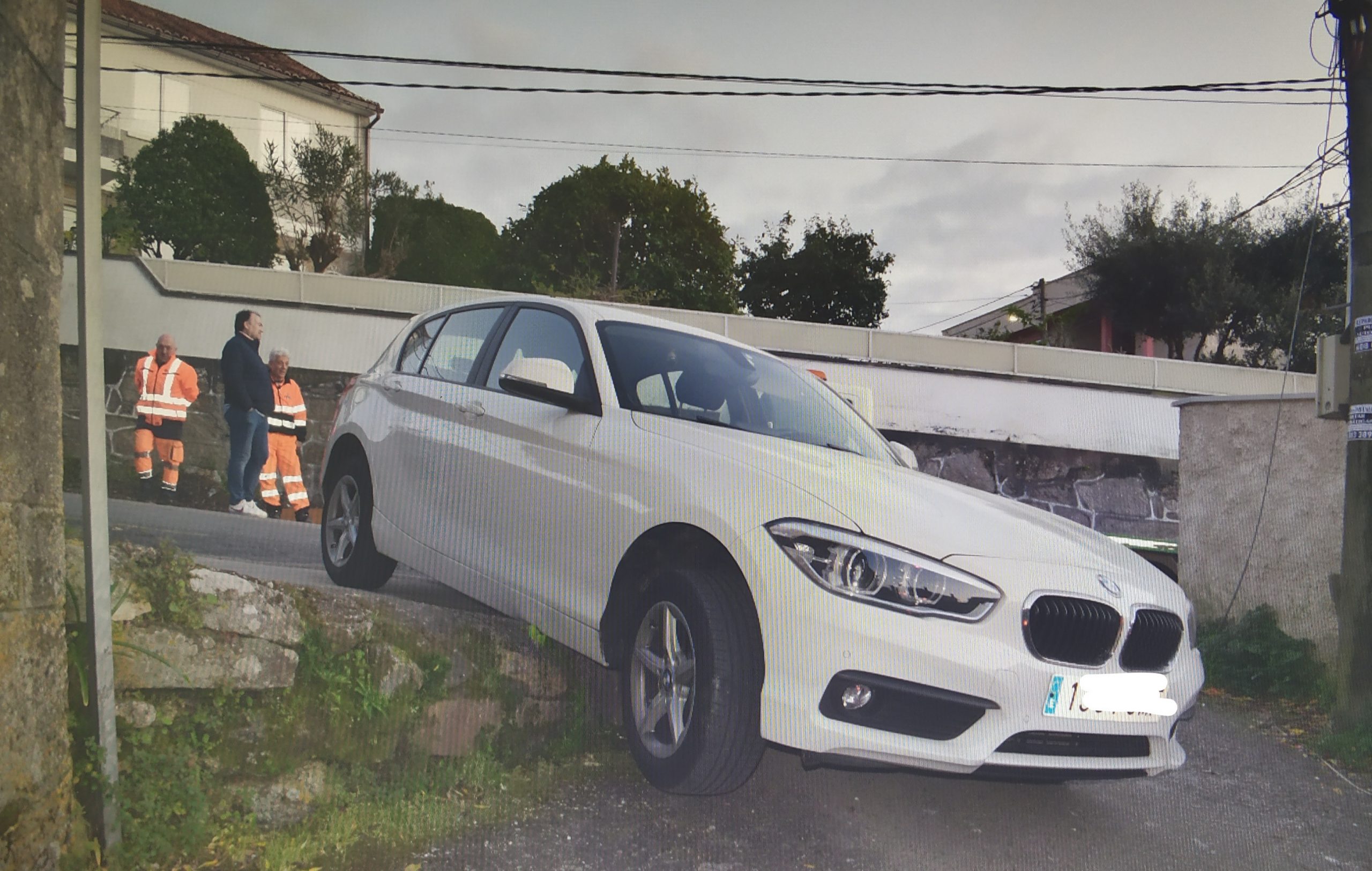 Menos aparatosa pero también algo llamativa fue la actuación llevada a cabo en Coruxo. Según se alertaba, un coche se había salido de la vía y se encontraba colgando de un escalón de un metro de altura.