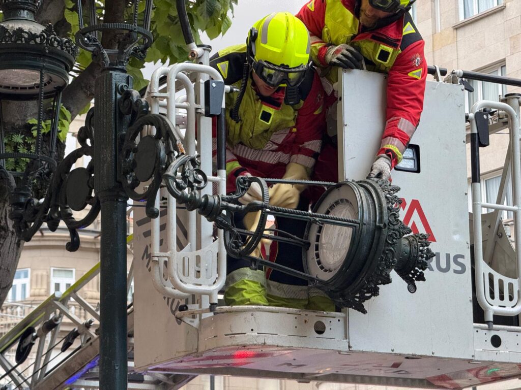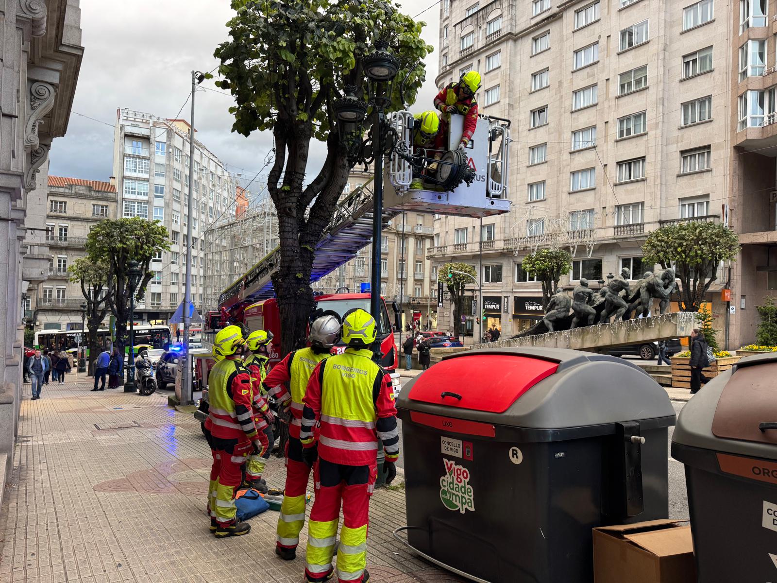 Susto en pleno centro de la ciudad tras el derrumbe de una farola que obligó intervenir a los Bomberos de Vigo.