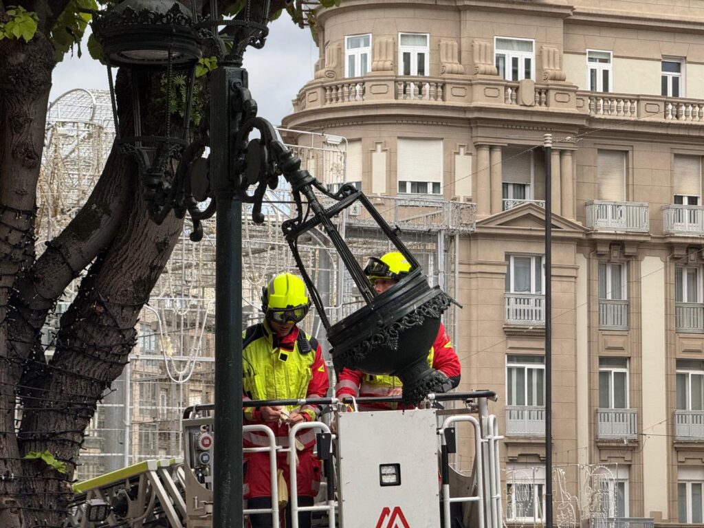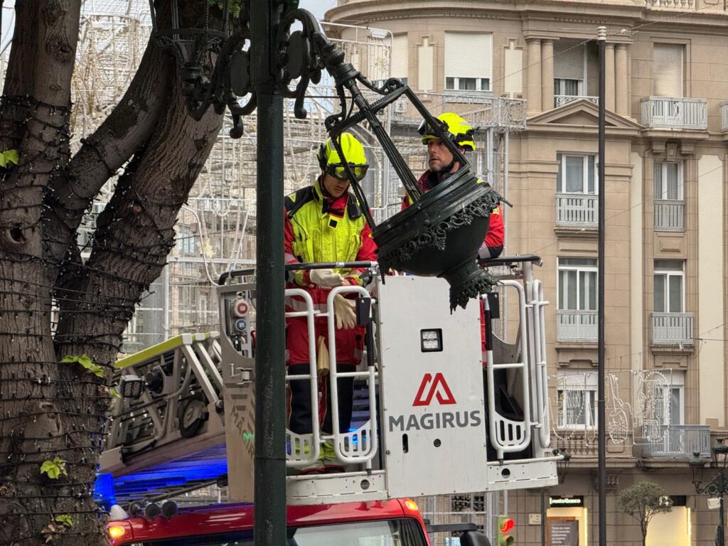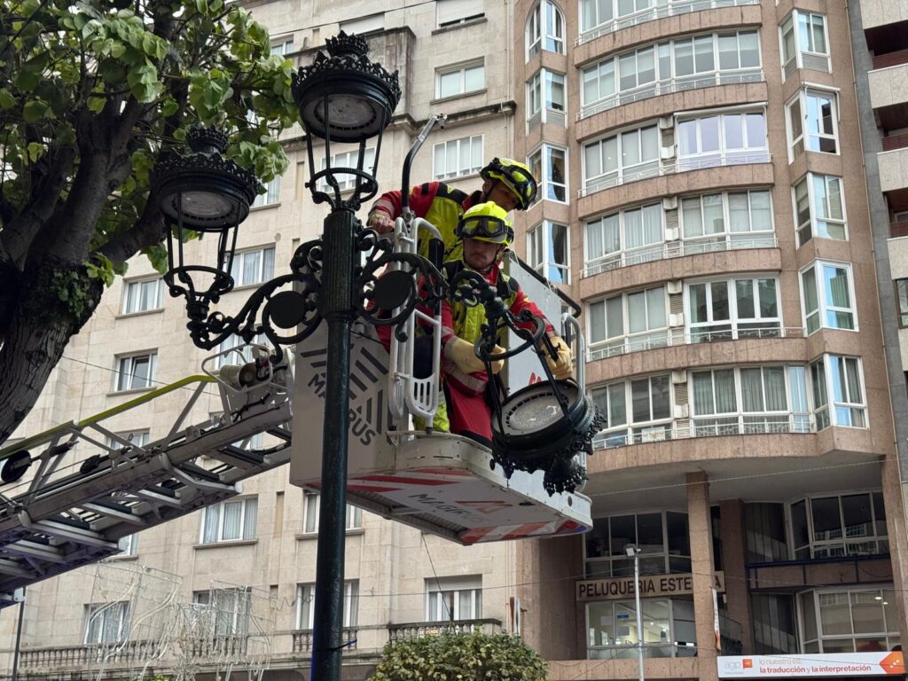 Un grupo de efectivos de los servicios de emergencias tuvieron que desplegar el camión escalera -a la altura de la estatua de los Rederos de Ramón Conde- para evitar la caída y asegurar una vieja farola que estaba completamente descolocada de su base y a punto de caer sobre la calle y la calzada, con la suerte de que en ese momento nadie se encontraba bajo la misma y de que los Bomberos llegaron al aviso antes de que se pudiese producir una desgracia mayor.